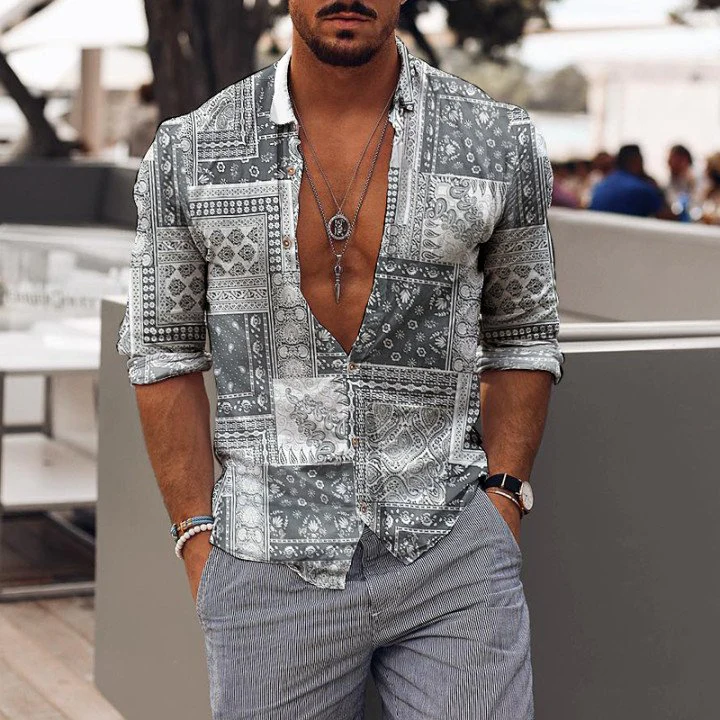 Retro Mens Holiday Ethnic Style Stitching Printed Shirt